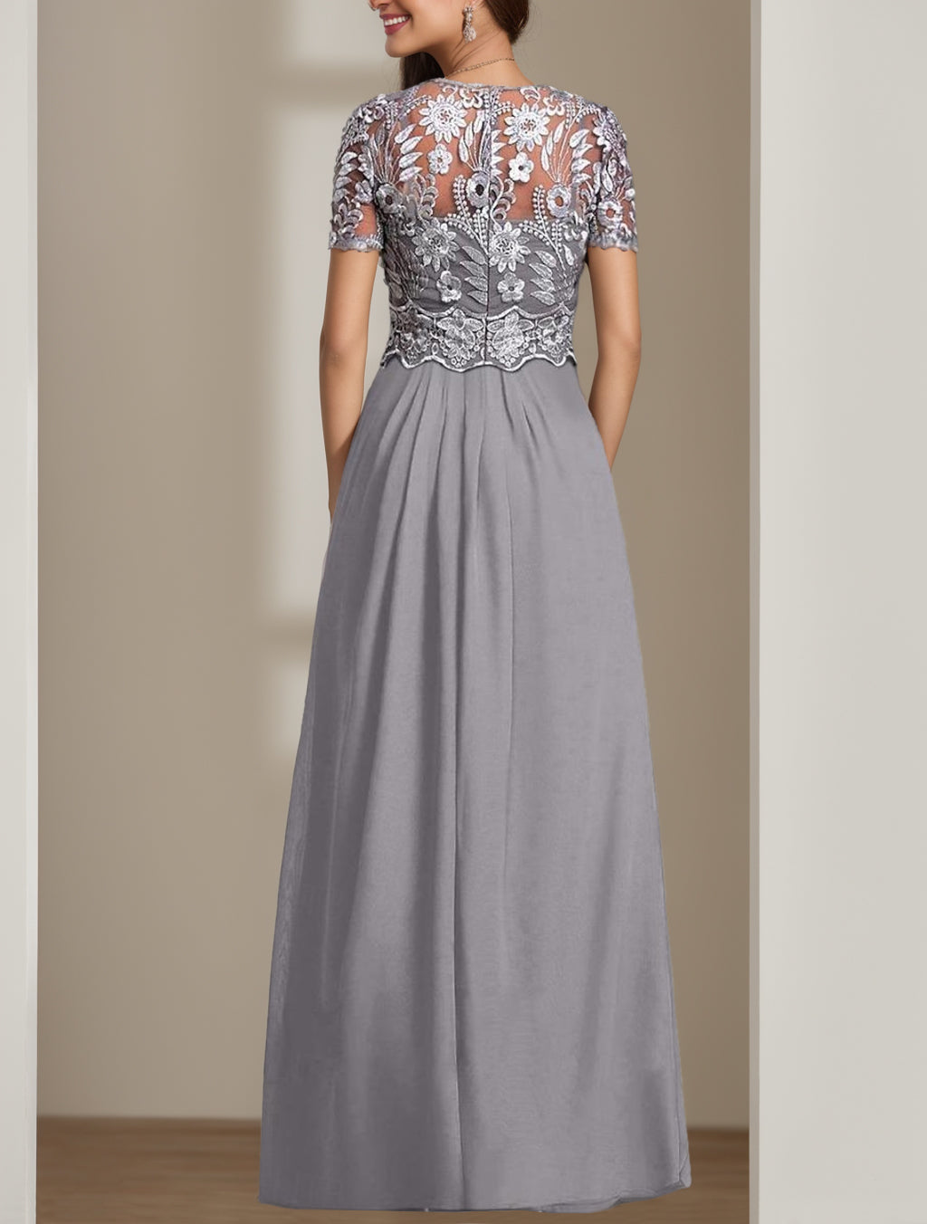 • Stretch Chiffon Round Neck Short Sleeves Floor Length Mother of the Bride Pantsuits with Appliques Lace